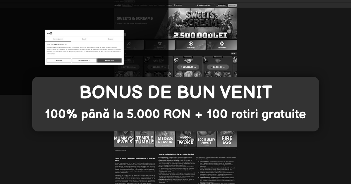 GetsBet Casino vă întâmpină cu o experiență de joc excepțională, oferind un bonus de bun venit de 100% până la 5000 RON pentru jucătorii din România. Cu cerințe de rulaj de doar 35x, acest bonus generös vă permite să explorați peste 2000 de jocuri captivante. Licențiat în Curaçao, cazinoul nostru garantează siguranță și echitate maximă. Beneficiați de retrageri rapide în maximum 24 de ore, suport clienți disponibil 24/7 și o gamă diversificată de jocuri cu jackpot online, ruletă live cu bonus și sloturi clasice. Partenerii noștri software includ NetEnt, Pragmatic Play și Evolution Gaming, asigurând calitatea superioară a fiecărui joc. Platforma este complet optimizată pentru dispozitive mobile, permițând accesul oriunde vă aflați. Acceptăm metode de plată populare în România, inclusiv carduri bancare, portofelele electronice și transferurile bancare instant.